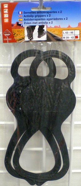 2 pointures disponibles: M 39-42 - L 43-46 . Elles sont équipées de petites pointes métalliques permettant de ne pas glisser sur le sol verglacé.