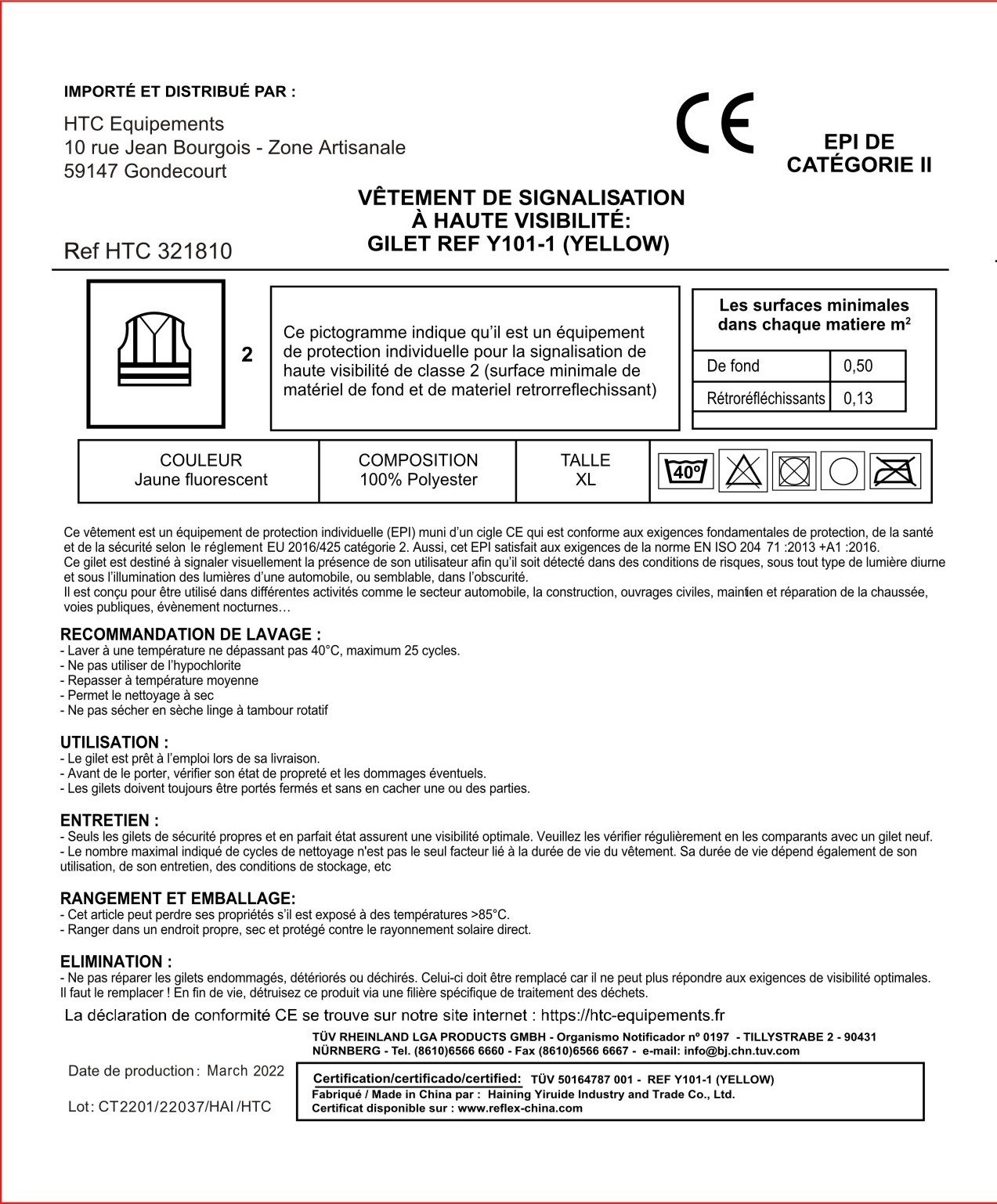 Conforme à la norme EPI : EN ISO20471:2013+A1:2016 classe 2.