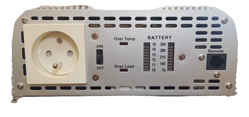 Protections :Surchauffe, Surcharge et inversion de polarite , coupure automatique en cas de court circuit tension batterie trop élevée ou baisse importante de tension de batterie; alarme batterie basse