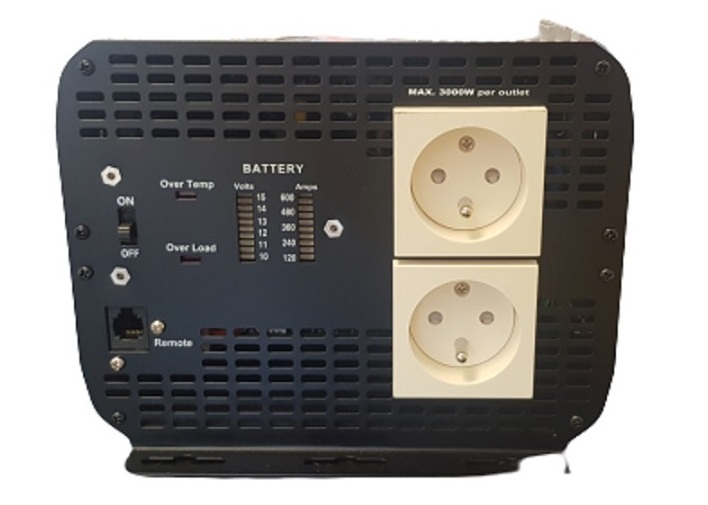 Protections :Surchauffe, Surcharge et inversion de polarite , coupure automatique en cas de court circuit tension batterie trop élevée ou baisse importante de tension de batterie; alarme batterie basse