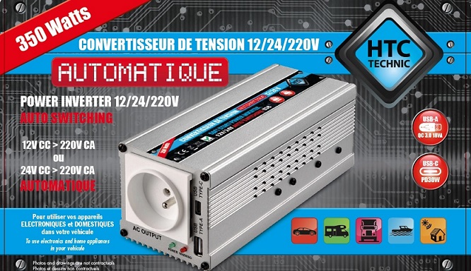 CONVERTISSEUR 12/24V AUTO 220V 350W AVEC PRISES USB-A & USB-C PD30W
