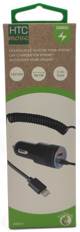 Chargeur allume cigare 12V / 24V Lightning + USB A 3.1A supplémentaire avec câble spirale 1m