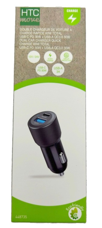 Chargeur de voiture 12V/24V double USB charge rapide 60W total USB-A QC3.0 30W + USB-C PD 30W