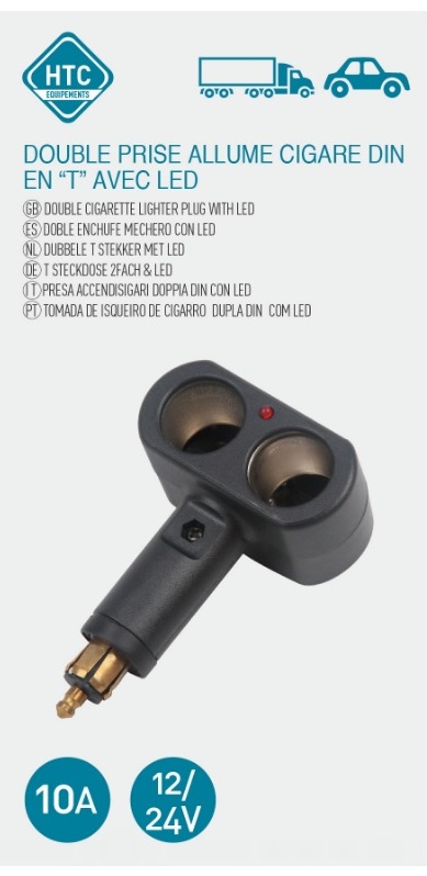 Double prise allume cigare femelle 12V / 24V en T connecteur DIN haute puissance 10A