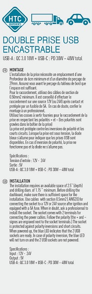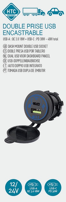 Double prise USB encastrable 12V/24V USB-A QC3.0 18W + USB-C PD 30W 48W total