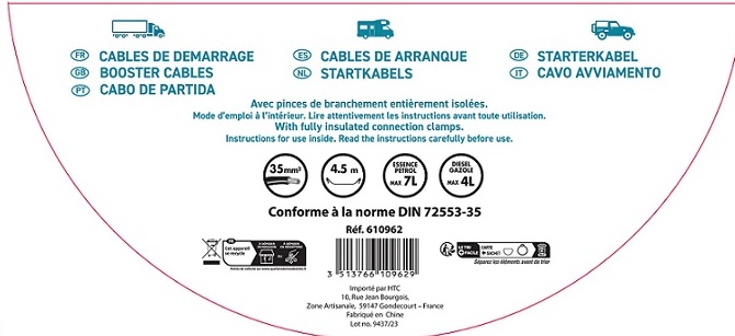 Avec pinces de branchement entièrement isolées. Pour véhicules avec moteur essence jusqu'à 7L et pour véhicules à moteur diesel jusque 4L maximum.