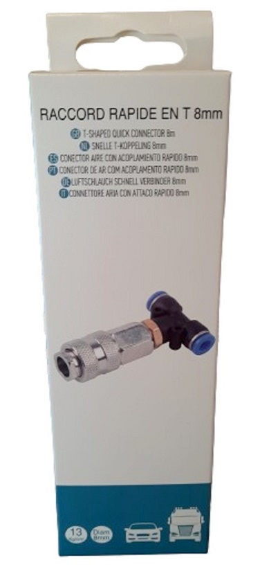 Raccord rapide en forme de T, conçu spécifiquement pour une utilisation avec des soufflettes, doté d'une valve de fermeture automatique innovante en bille de bronze.