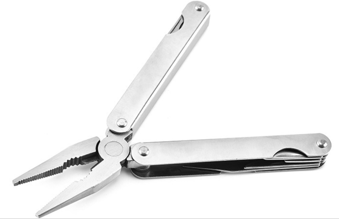 Pince universelle- Pince à bec long- Pince coupante- Lime- Ecailleur de poisson - Dégorgeoir - Règle graduée en pouces- Petit tournevis cruciforme - Petit tournevis plat - Tournevis plat de taille moyenne - Grand tournevis plat- Ouvre boîte- Ouvre bouteille- Couteau - Lame de type drop point