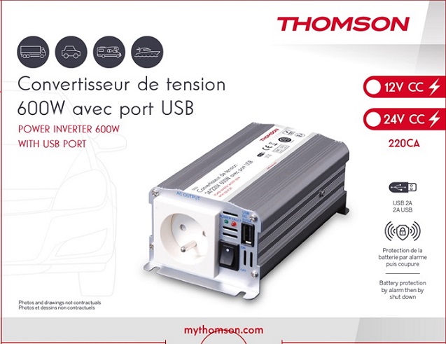CONVERTISSEUR DE TENSION THOMSON 12V / 220V 600W AVEC PRISE USB-A 2A