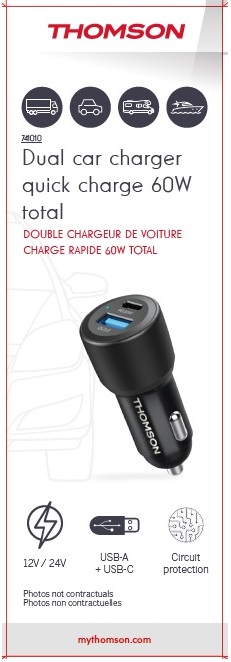 CHARGEUR DE VOITURE THOMSON 12/24V PD 30W + QC 3.0 30W (Total 60W )