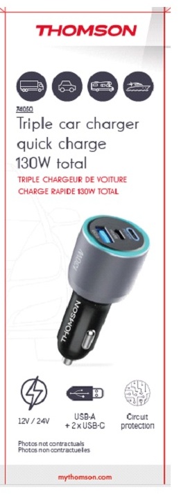 CHARGEUR DE VOITURE THOMSON 12/24V 2 USB-C PD 100W + PD 30W + QC 3.0 18W (Total 130W )