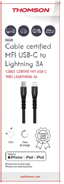 CÂBLE THOMSON CERTIFIÉ MFI USB-C VERS LIGHTNING 3A